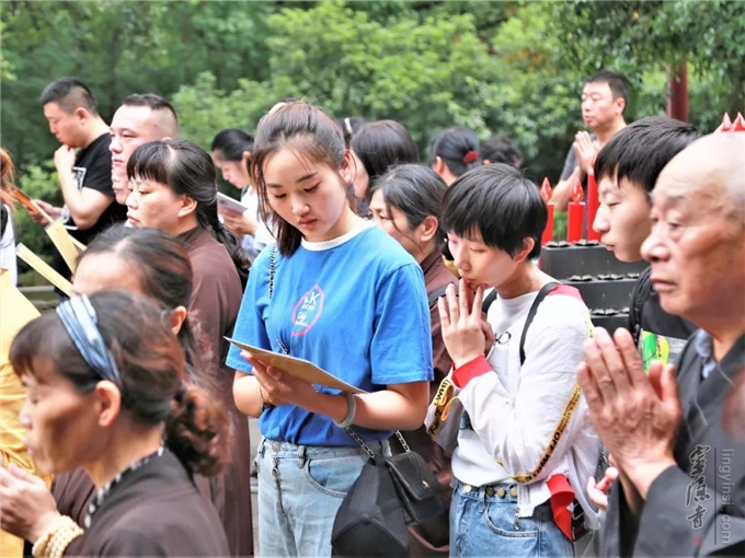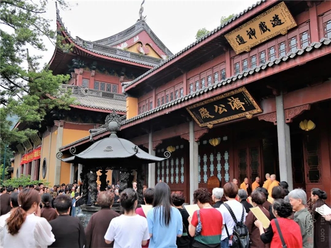 早上七点,善信居士从四面八方赶来,在济公殿前云集。灵隐寺监院义广法师拈香主法。