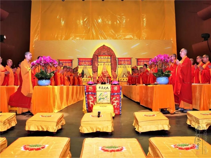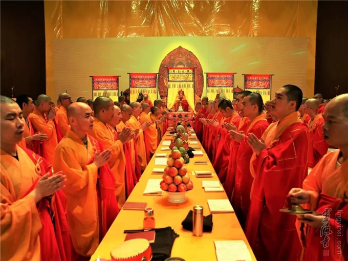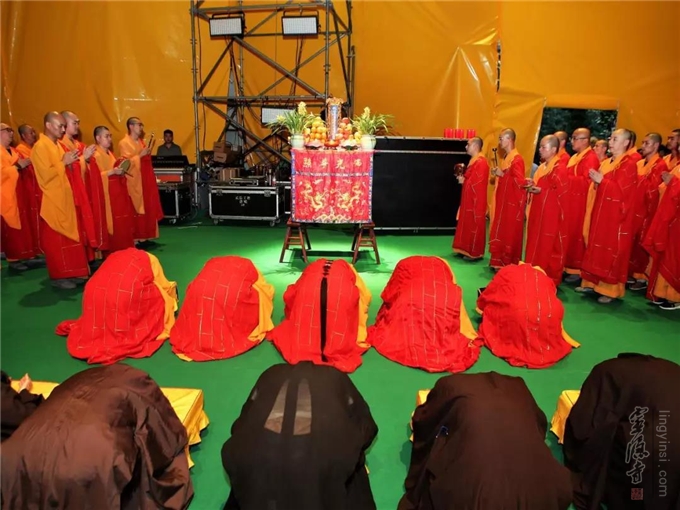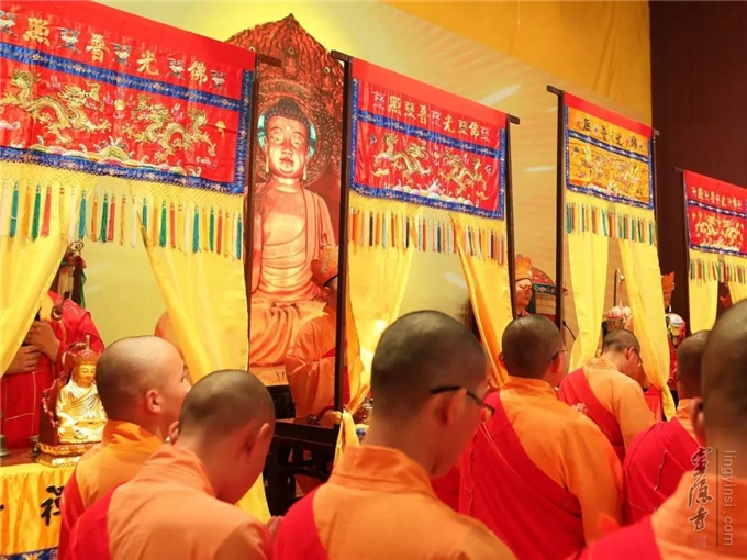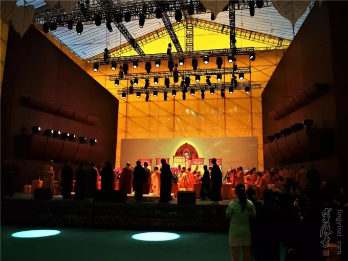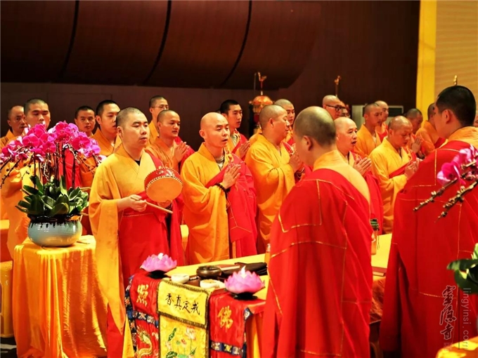 2019年8月15日(己亥农历七月十五)傍晚六时三十分至次日零时,杭州灵隐寺在紫竹广场举行己亥安居共修华严法会暨盂兰盆会之五大士瑜伽焰口佛事。