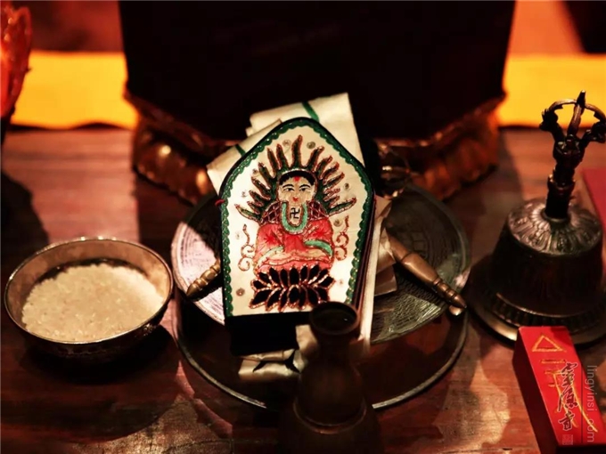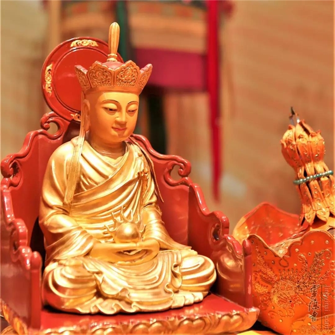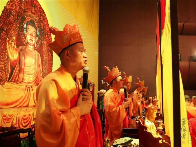 五大金刚上师登坛上座、头戴毗卢帽、诵《瑜伽焰口》经,法音绕梁,佛铃净心,说法施食。