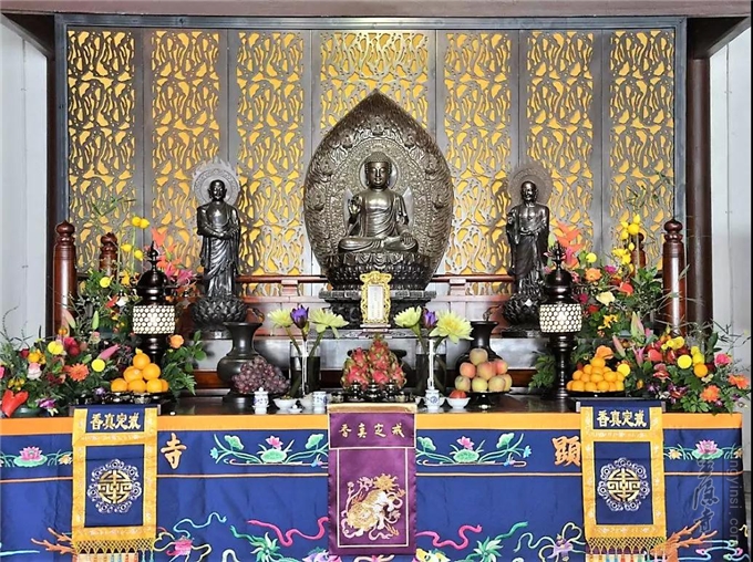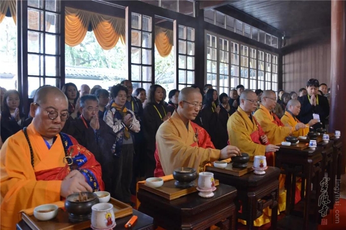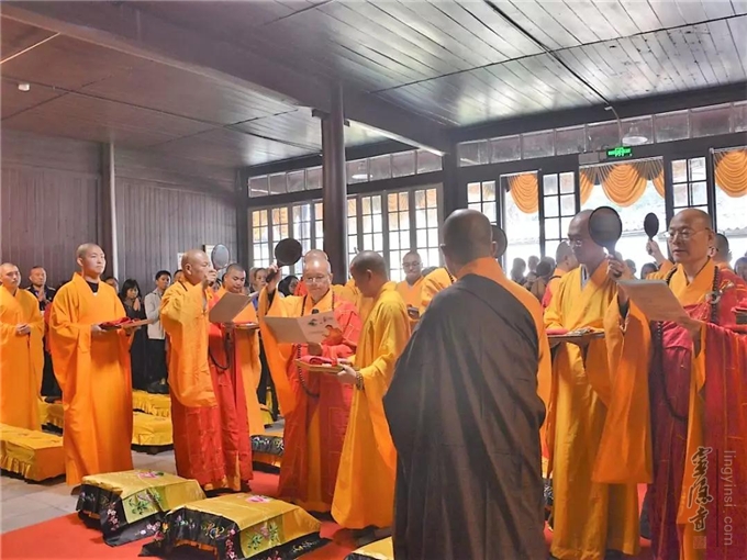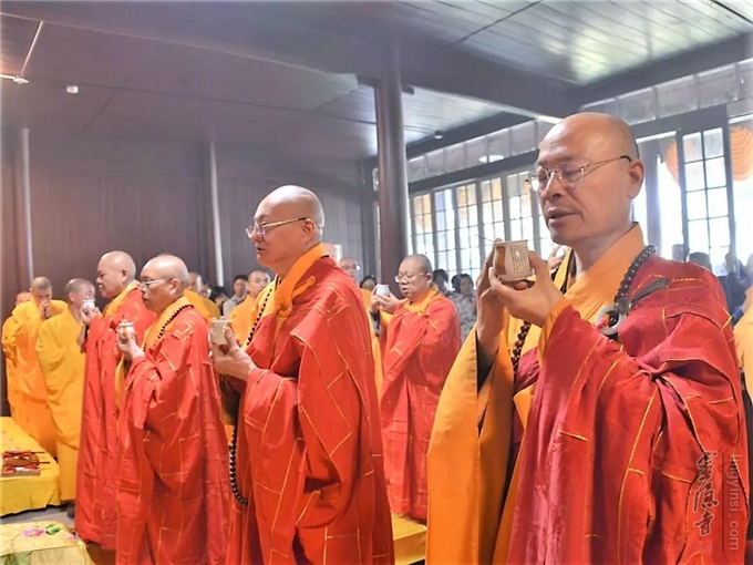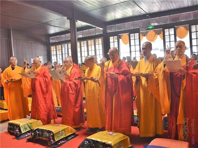 上午10时,钟鼓齐鸣。杭州显宁寺两序大众至诚礼请心澄法师、宏度法师、秋爽法师、光泉法师、园慈法师、怡学法师、隆相法师、月真法师、智圆法师、戒兴法师、戒清法师、念顺法师、印旭法师等共同为大殿佛像开光主法。