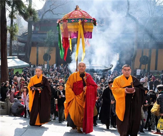 元旦上午,常住法师齐聚大雄宝殿,香云普覆,梵音绕梁。檀越善信恭迎灵隐寺方丈光泉大和尚主持上堂大斋。