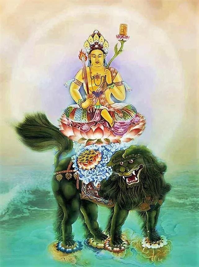 文殊菩萨的形象,通常是手持慧剑,骑乘狮子,比喻以智慧利剑斩断烦恼,以狮吼威风震慑魔怨。