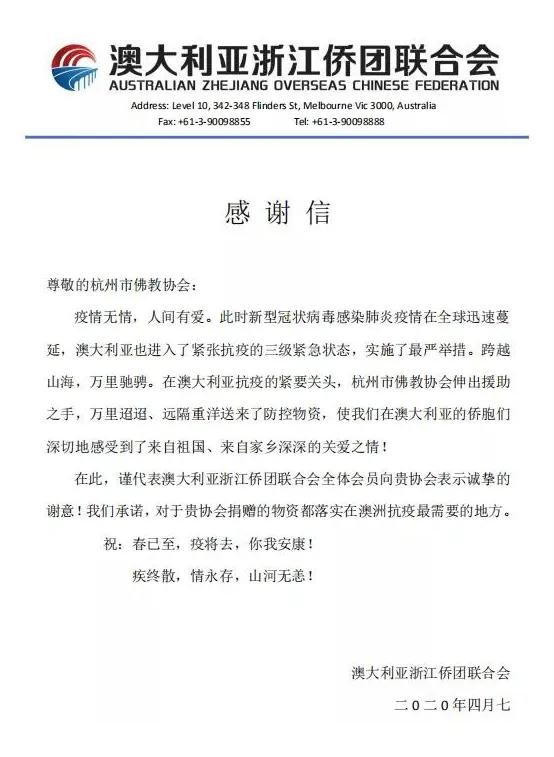 疫情在全球蔓延,杭州市佛教协会还相继为美国、英国、澳大利亚等国的华人华侨捐送口罩20000多个,另有灵隐寺向日本捐赠抗疫善款10万元人民币。英国浙江联谊会、澳大利亚浙江侨团联合会等相继发来感谢信,感谢杭州佛教界万里驰骋的守望相助。