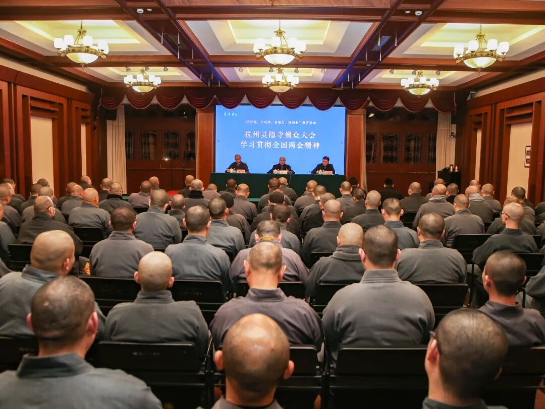 3月9日,杭州灵隐寺组织召开全体僧众大会,学习贯彻2026年全国两会精神。