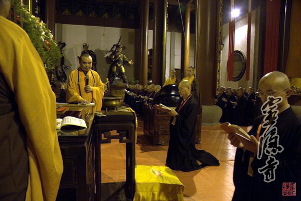 晚上,戒子们练习此前已经学过的逢二叉班和向上排班的仪轨,聆听开堂大师傅芳振法师教授请引礼和三师的仪轨,芳振法师慈悲讲解"戒和尚开导文",教新戒们唱念露罪忏悔"香赞",为礼请三师作准备。结束后,戒子们继续拜愿忏摩。