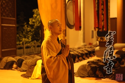 晚上,新戒提前到药师殿先练习了展具,之后由陪堂师父觉三法师带领大家拜愿忏摩。