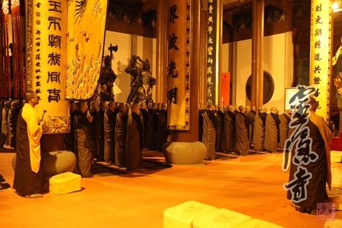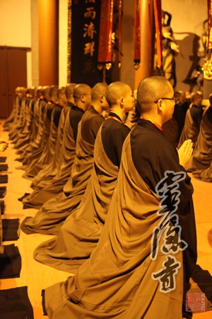下午,在大师父芳振法师的带领下,新戒演习受比丘戒的登坛仪式。从药师殿到法堂,队伍严整分班有序,又从法堂到药师殿,大师父为新戒开示了演匍伏班之大意。