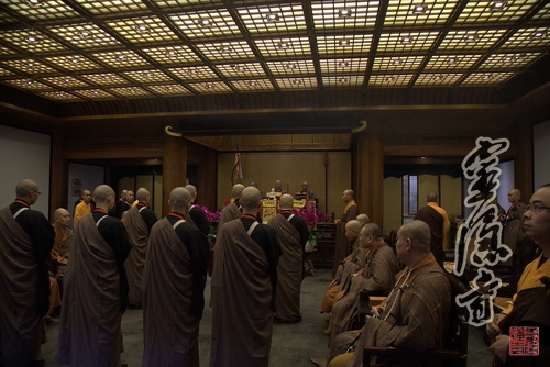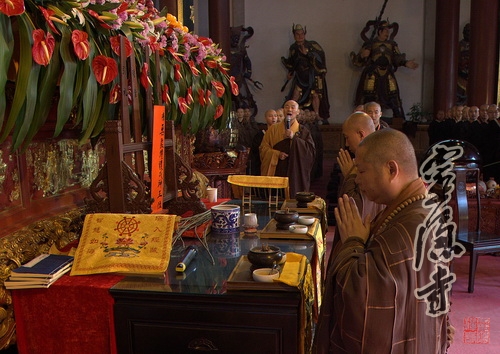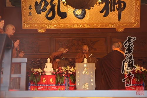 将十师迎入药师殿,新戒们展具长拜,合掌恭立,三师拈香礼拜毕,十师依次入座,一番慈悲开示。开示完毕,新戒至诚顶礼三拜,仍以庄严仪仗将十师恭请至法堂,登比丘坛。
