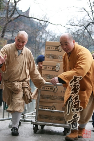 灵隐寺师父们推拉并用把腊八粥送往施粥点