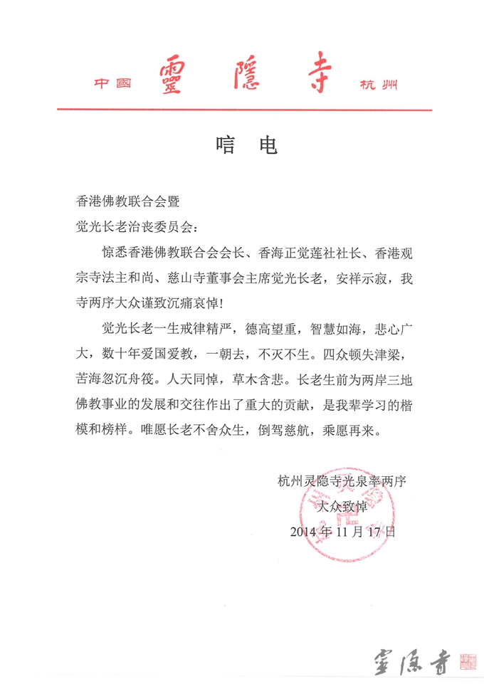 灵隐寺方丈光泉大和尚致唁电悼念觉光长老