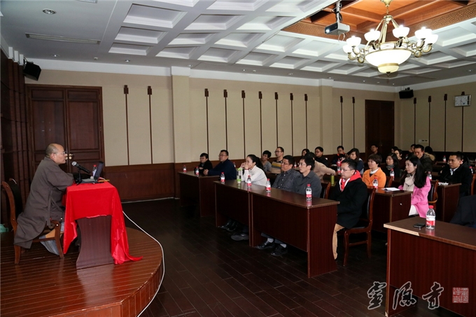 2015年1月17日下午,灵隐寺方丈光泉大和尚在寺内华严阁为上海基玉投资管理有限公司工作人员开示佛教文化,他以某歌手青年病逝为话头,引导这些来自金融界的白领们参悟 "活在当下,关照当下"的禅的精神。