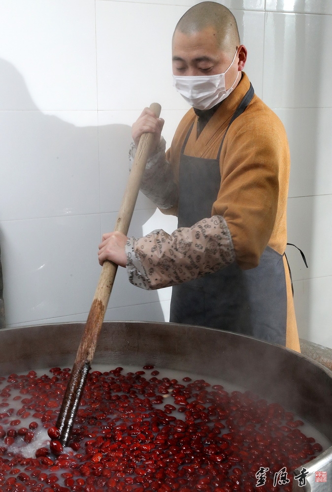 同样穿着白色工作衣、戴着白色工作帽的沈居士托着托盘,托盘上盛放着刚刚出锅还冒着热气的腊八粥。她说今天是腊月初一,腊八粥要先供养佛菩萨的。她托着托盘小心翼翼从五观堂一直走到天王殿,一边说:走路时腰要挺着,要平稳,不然刚煮好还温热的腊八粥因为晃荡而变稀变水的……