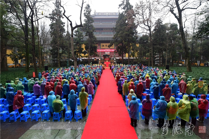 在这个佛成道的吉祥日子里,还有另外一群维持现场的秩序的人,颇为引人注目。为了保证讲经传供祈福法会顺利、有序地进行,云林志工团义工在法会现场手举"止语"牌,认真尽责地做着现场引导员、分发雨衣,忙得不亦乐乎。