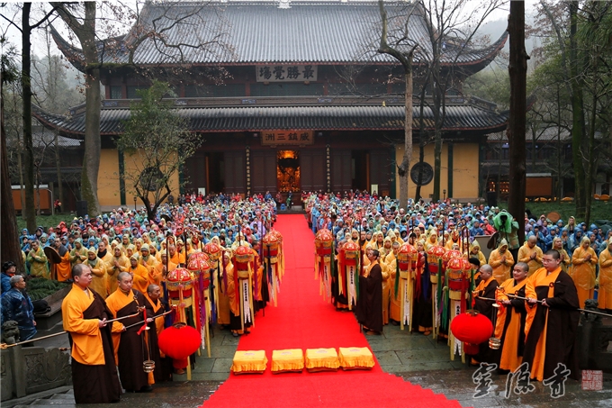 2015年1月27日,农历腊月初八,释迦牟尼佛成道纪念日。为纪念本师释迦牟尼佛成道,杭州灵隐寺在大雄宝殿举行了大型的"甲午年释迦牟尼佛成道日讲经传供祈福法会",光泉大和尚登坛说法,开示腊八粥的缘起、意义。来自杭州灵隐寺、杭州佛学院的法师们以及八百名信众和随缘来灵隐寺祈福的游客信众同沾法喜,欢天喜地地参加了此次盛会。