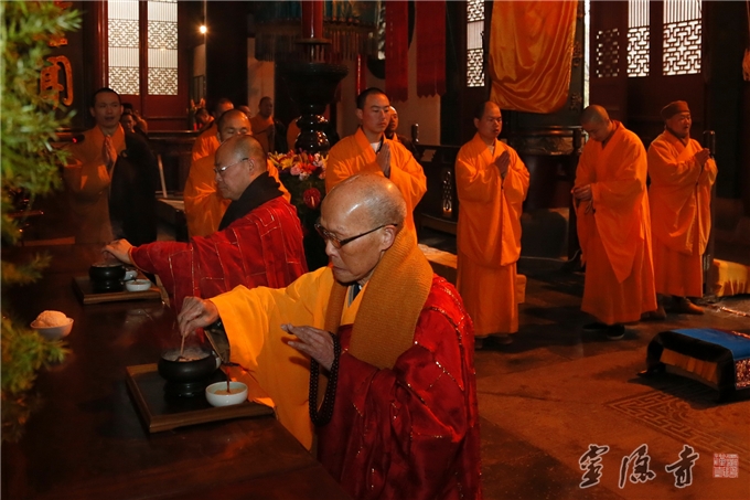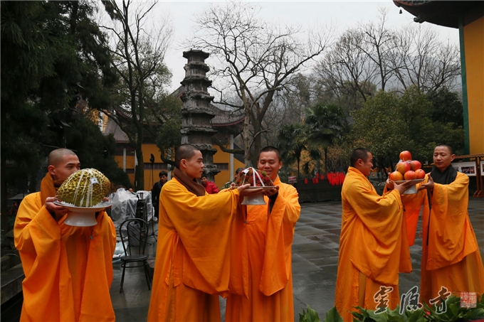 今年,为确保寺院的安全、有序,也为了让大众过上一个安全祥和的腊八节,灵隐寺内当天没有对外发放腊八粥,而是以讲经、传供等方式纪念本师释迦牟尼佛成道,这在灵隐寺还是首次。灵隐寺大众将这份法喜回向给即将到来的2015乙未羊年,并祈福世界和平,国泰民安,风调雨顺,人民幸福。