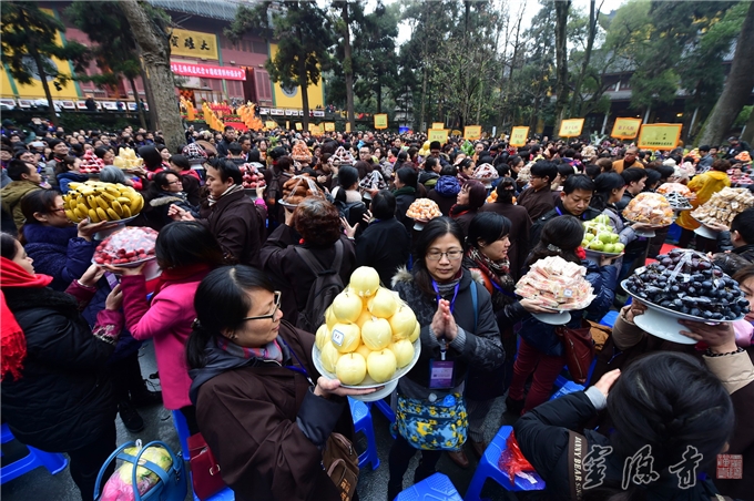 长长的传供队伍列为两队,从天王殿曲折延伸,一直排到大雄宝殿。穿着僧衣的法师,披着海青的居士,随喜的善信,共同见证了这殊胜的传供法会。在声声"南无本师释迦牟尼佛"的圣号中,大众依次将供品举过额前,向伟大的佛陀传递自己最崇高的恭敬之意。香花果品,百味饮食,香油锭烛,尽世甘美,一应供养器物,在四众弟子的一双双手中传递,最后虔诚地呈供到鲜花布满的佛前。