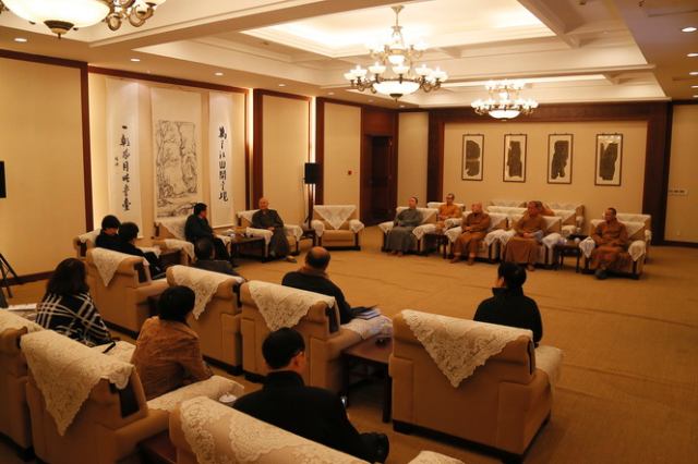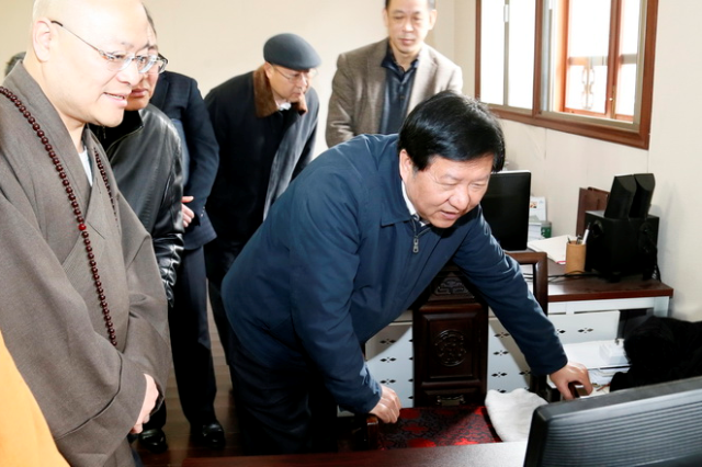 光泉大和尚介绍了灵隐寺及杭州佛教近年来发展状况,毛光烈副主任特别了解了汉传佛教讲经交流、托钵行脚慈善活动、灵隐寺腊八施粥、取消除夕头香以及灵隐寺的弘法、文化、义工、消防、安全等方面的情况,他专门到文宣部察看了灵隐寺的弘法与文化工作,并打开网页观看了灵隐寺网站;到监控室察看了灵隐寺的安全保障系统;到云林图书馆了解佛教文献保存现状。他肯定了灵隐寺僧众精进修行、积极弘法及在净化人心、服务社会方面所起的作用。