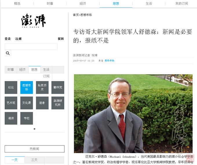 近日,当代美国最具影响力的媒介社会学者、哥伦比亚大学新闻学院教授迈克尔•舒德森(Michael Schudson)访学上海时接受澎湃新闻采访,对于当代新闻传播的前景,他认为"新闻是必要的,报纸不是"。他此次到上海的访学,还到过香港和杭州,他特别提到在杭州的观感:"我倒是对杭州的灵隐寺印象很深,我看到很多人在里面拜佛祈祷,是真的祈祷,不是走马观花的游客。我之前就听说过这些年宗教在中国复兴,但这是我第一次亲眼看到。"