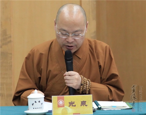 会上,佛教教育委员会的24位委员们和有关专家学者就推动我国汉传佛教院校教育进一步发展进行了积极、踊跃的发言。光泉法师表示,佛教院校建设总体来说包括日常教学、图书馆建设和学术研究三大部分。在日常教学上,他提议增加弘道学,教育学僧如何弘道弘法,增强法师们的弘道热情,提高弘法能力。在图书馆建设上,建议设立制度加强对图书馆建设的持续投入,避免出现在初次建成之后便止步不前的现象。在学术研究上,他认为就目前的情况来看,还远远不够,比如灵隐寺办一次学术研讨会,提交论文来参会的法师比例不到总人数的10%,需要花大力气鼓励佛教院校进行或参与各具特色的课题研究。