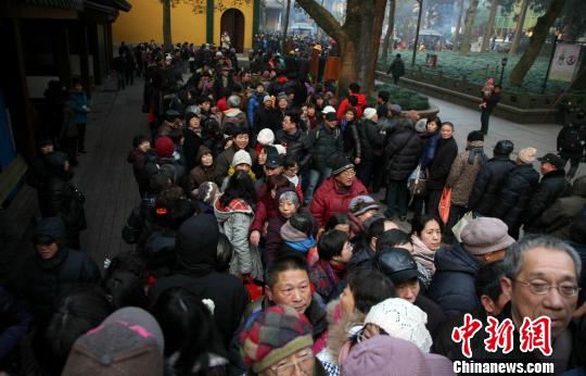 杭州灵隐寺万人长龙守候平安粥。 李晨韵 摄