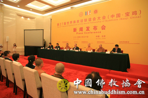 2014年6月30日下午,第27届世界佛教徒联谊会大会新闻发布会在人民大会堂北京厅举行。"世佛联"秘书长攀洛•泰阿利先生,中国佛教协会 副会长、陕西省佛教协会会长、第27届"世佛联"大会陕西省组委会副主任增勤法师,中国佛教协会新闻发言人普正法师、明杰法师,宝鸡市组委会副主任张敬原 先生介绍了大会筹备情况并回答了记者提问。