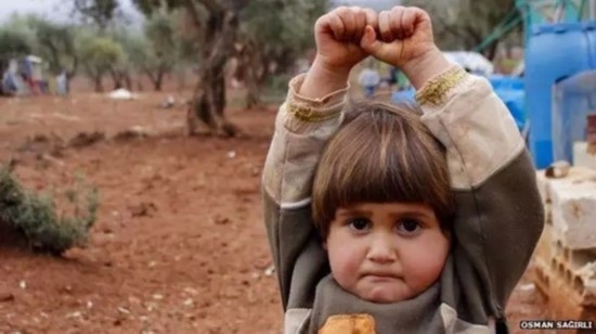 这张照片是摄影记者萨厄尔于去年12月拍摄,当时这位摄影师正在同当地一个争取人权的无政府组织IHH工作,并走访了许多难民营。萨厄尔说:"我当时用的是长焦镜头,她以为那是把枪。后来我才意识到她当时很害怕,因为她紧咬嘴唇,还举起了双手。一般情况下孩子见到相机要么跑开,要么捂脸,要么微笑。"他说,"在孩子身上更容易看到他们所经历的不幸。"