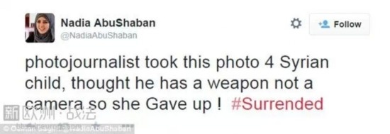 前段时间,另一名摄影记者NadiaAbuShaban在推特上发布了这张照片并留言:"她以为他拿着的是一件武器,所以她投降了。"