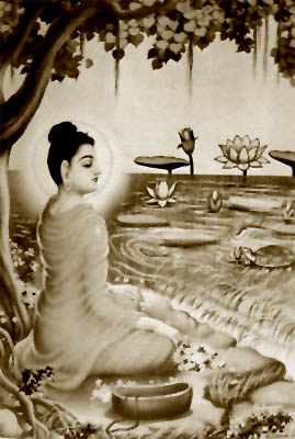 释迦牟尼放弃苦行活后,来到了今名菩提伽耶的地方,在一株高大茂郁的毕波罗树(又译菩提树,即无花果树)下坐了下来,他发下誓愿:"我如果不圆成正等正觉的佛果,宁可碎此身,终不起此座!"