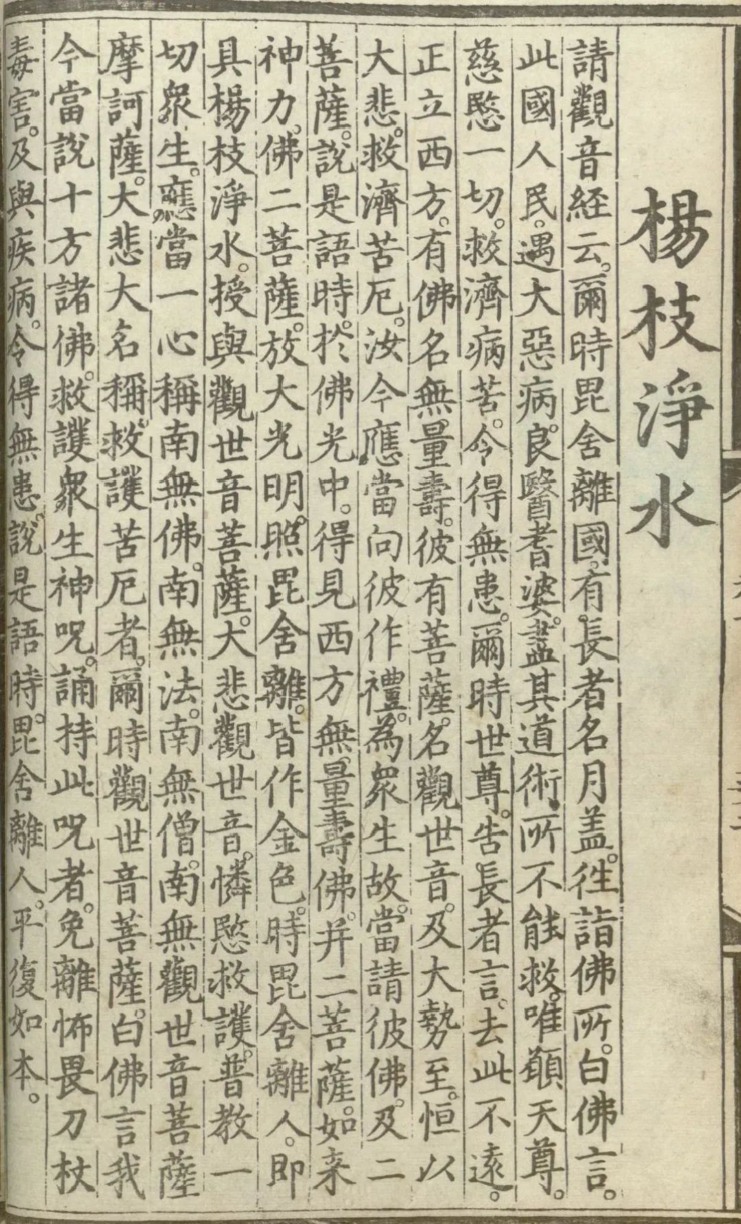 时毗舍离人即具杨枝净水。授与观世音菩萨。大悲观世音怜愍救护。普教一切众生。应当一心称南无佛。南无法。南无僧。南无观世音菩萨摩诃萨。大悲大名称。救护苦厄者。