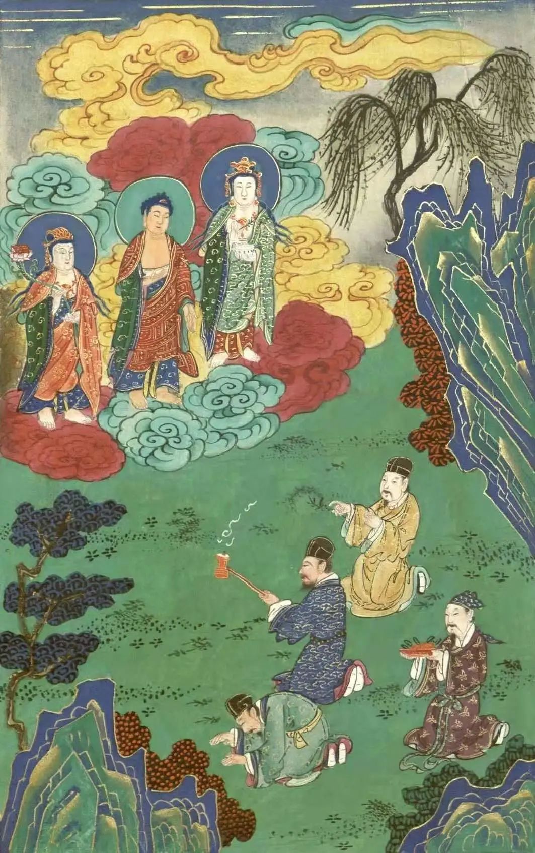佛一边说着,同时于佛光中,现西方无量寿佛并二菩萨,令长者了了得见;又以如来神力故,无量寿佛及二菩萨,放大光明,照毗舍离国,皆作金色。