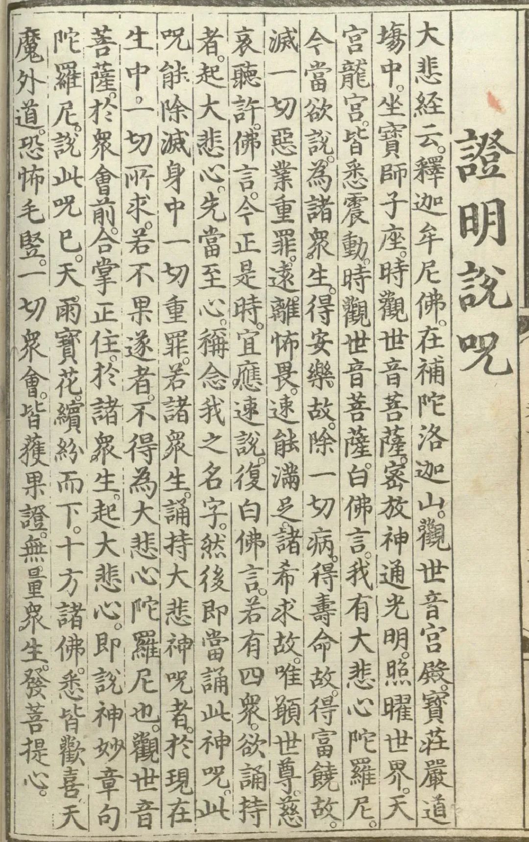 时观世音菩萨白佛言。我有大悲心陀罗尼。今当欲说。为诸众生得安乐故。除一切病得寿命故。得富饶故。灭一切恶业重罪。远离怖畏。速能满足诸希求故。唯愿世尊慈哀听许。佛言。今正是时。宜应速说。