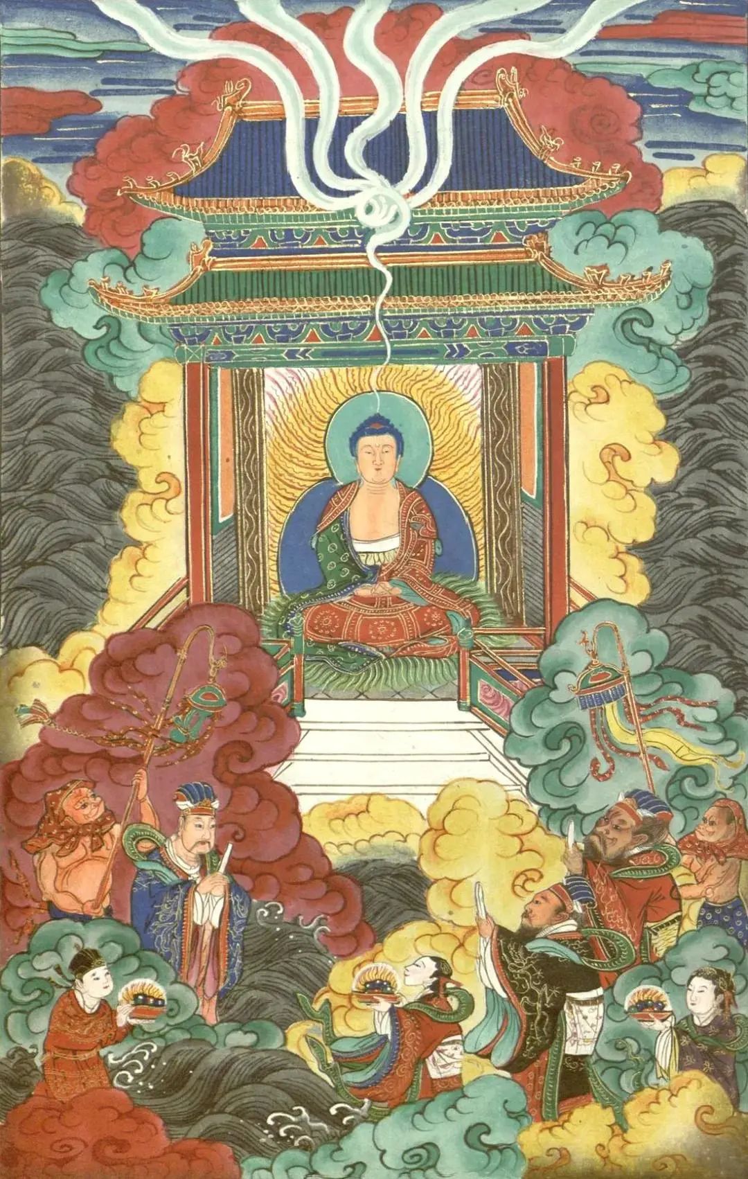 《大云轮请雨经》上说:有一次,佛来到优婆难陀龙王宫内,住在大威德摩尼藏大云轮殿宝楼阁中。当时有无量诸龙王众,以无量香花、幢幡缯盖、珍珠缨络供养如来。