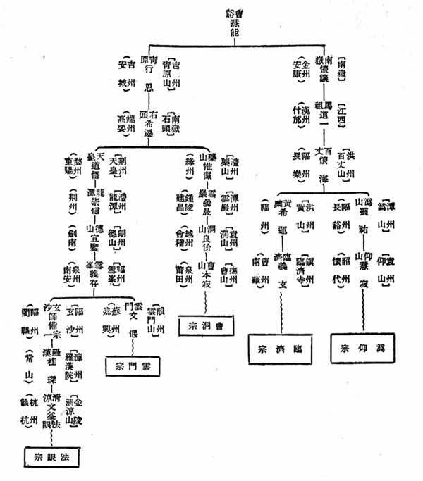 此外,临济宗由兴化(魏府)存奖(830—888)、宝应(汝州)慧颙(?—952)相承;曹洞宗由洞山云居道膺一系同安道丕、同安观志相承;沩仰宗由仰山南塔光涌(850—938)一系相承;各弘化一方,与法眼、云门并行。禅家五宗,至此完全建立。