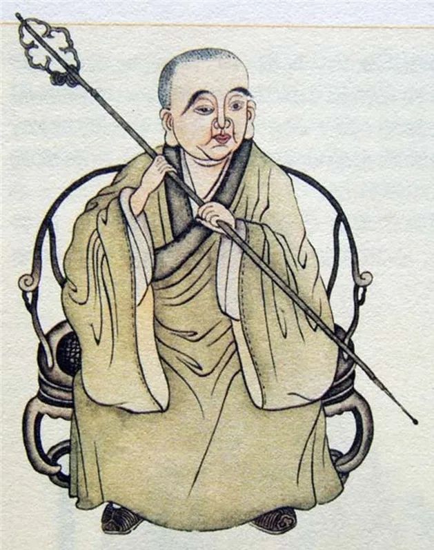 尊者法相所现为正面而坐,面露笑容,弯眉大耳,双手持锡杖。