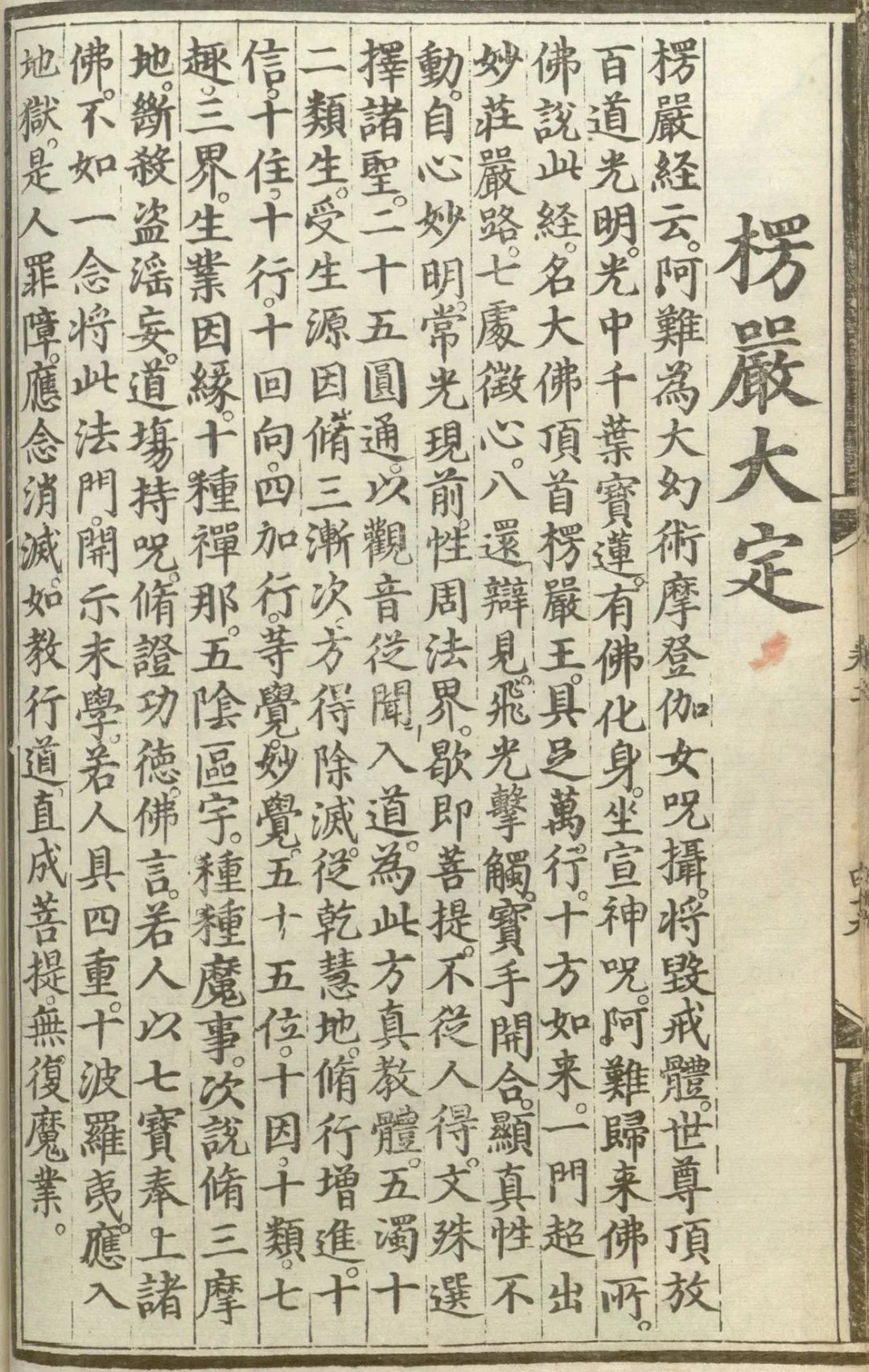 楞严经云。阿难为大幻术摩登伽女咒摄。将毁戒体。世尊顶放百道光明,光中千叶宝莲。有佛化身。坐宣神咒。阿难归来佛所。佛说此经。名大佛顶首楞严王。具足万行。十方如来。一门超出妙庄严路。七处征心。八还辩见。飞光击触。宝手开合。显真性不动。自心妙明。常光现前。性周法界。歇即菩提。不从人得。文殊选择诸圣。二十五圆通。以观音从闻入道。为此方真教体。五浊十二类生。受生源因。修三渐次。方得除灭。从乾慧地。修行增进。十信。十住。十行。十回向。四加行。等觉。妙觉。五十五位。十因。十类。七趣三界。生业因缘。十种禅那。五阴区宇。种种魔事。次说修三摩地。断杀盗淫妄。道场持咒。修证功德。