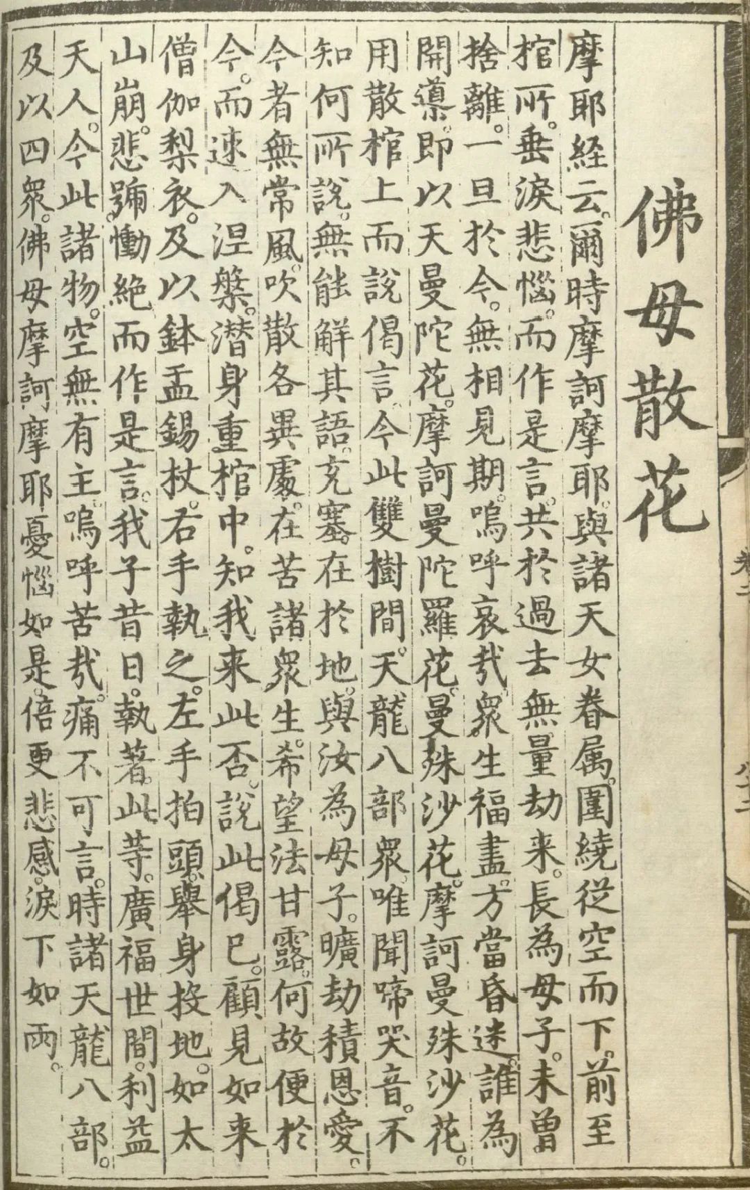 摩耶经云。尔时摩诃摩耶与诸天女眷属围绕。从空而下前至棺所。垂泪悲恼。而作是言。共于过去无量劫来长为母子。未曾舍离。一旦于今无相见期。呜呼哀哉。众生福尽。方当昏迷。谁为开导。即以天曼陀华。摩诃曼陀罗华。曼殊沙华。摩诃曼殊沙华。用散棺上。而说偈言。