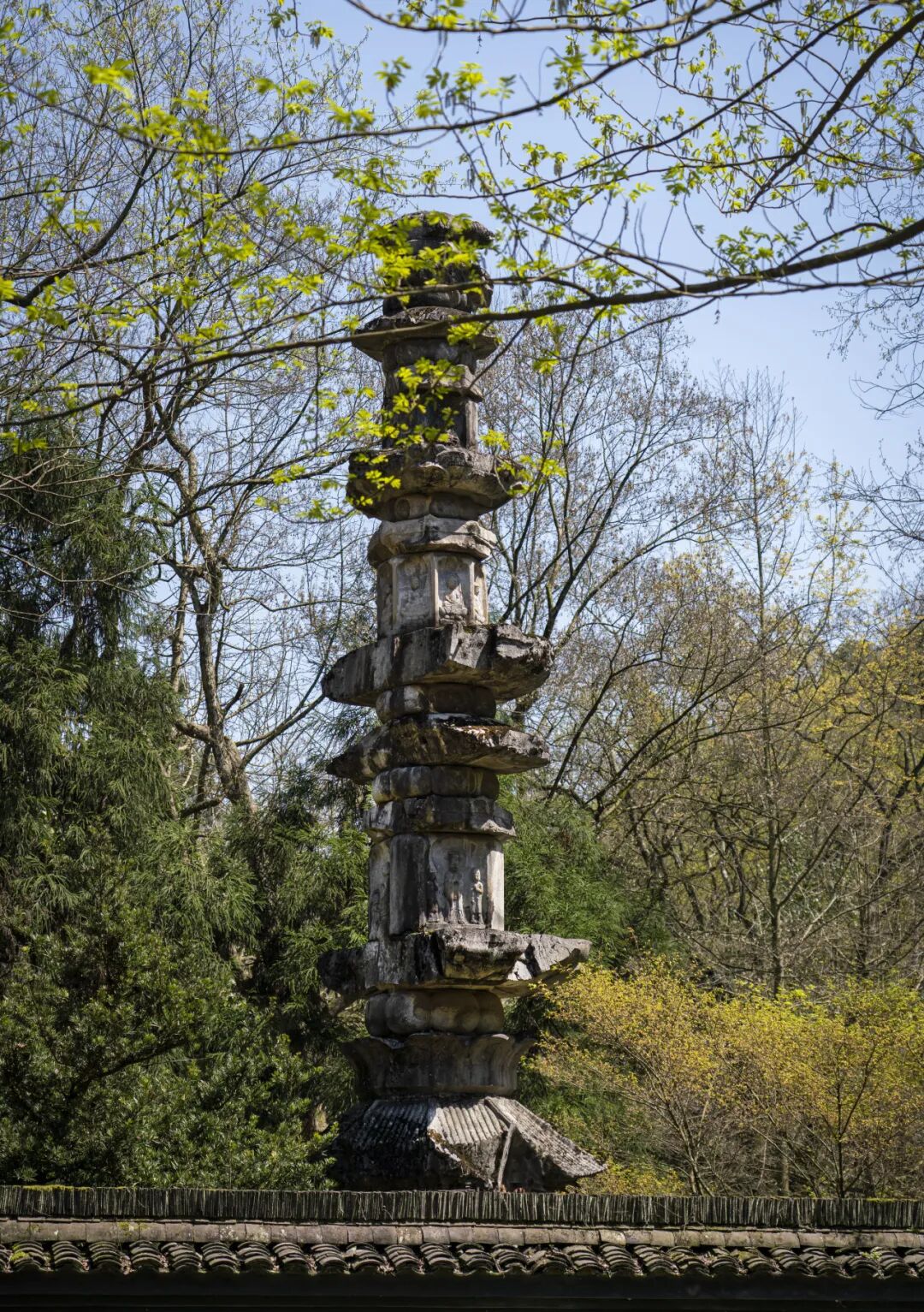 灵隐寺前左右各立一石幢,皆宋太祖开宝二年吴越国王建。左刻大佛顶尊胜陀罗尼,右刻随求即得大自在陀罗尼。此二石幢本在奉先寺,寺久废,神宗景佑二年十一月,灵隐寺住持延珊禅师迁来重建,距今约九百四十多年。又大雄宝殿前左右各有一石塔,皆九层,高五丈余,孙治寺志云:“上有石匾,书吴兴广济普恩真身宝塔十字,二塔所题皆同,而无年代日月。山中旧物,所存唯此。其塔八方,下刻佛顶首陀罗尼,二塔皆同。塔上所镌佛,皆梁像。此或慧理之后,六朝僧所为耳。其无岁年者,岂以朝梁暮陈故耶。”然据近人梁思成氏考证,系宋初建筑,距今约一千年。
