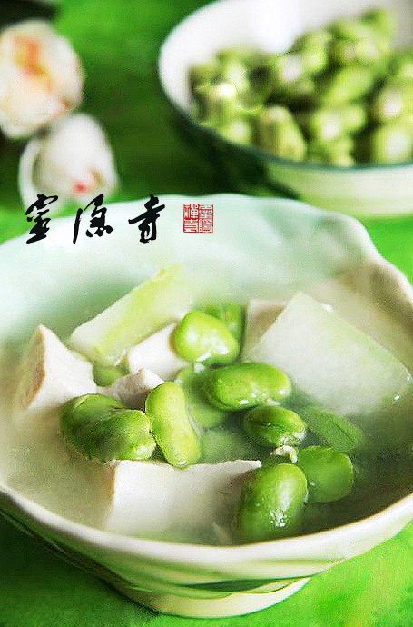 原料:鲜蚕豆200克,冬瓜200克,豆腐200克,盐,香油