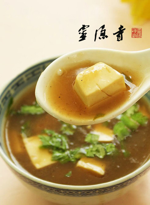 原料:酸辣汤料一包,嫩豆腐一块,芹菜叶子少许。