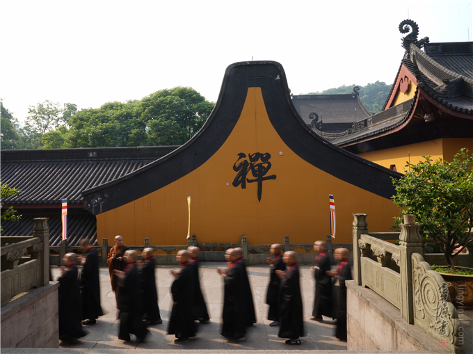引礼法师带领众新戒佛子诵经持咒由药师殿鱼贯而出,环灵隐寺古刹绕行一周,分别到达寺院东南西北四个界标位置,了解整个戒场的范围,称为"踏界"。