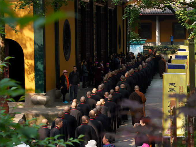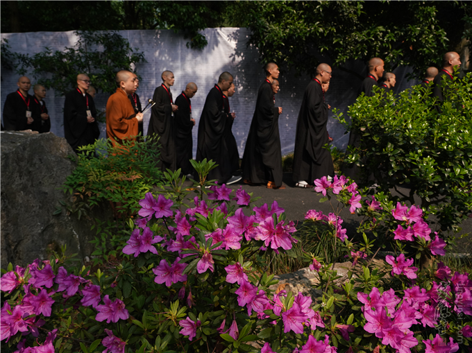 "戊戌春灵隐寺三坛大戒法会"第二天,新戒弟子在戒和尚光泉大和尚、开堂师芳振法师及诸引礼师的带领下,绕灵隐古刹"踏界",灵隐戒场结界立标,唱戒结坛。