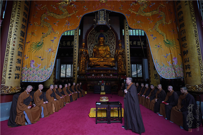 4月27日,戊戌春灵隐寺三坛大戒第三天,在灵隐寺药师殿举行「礼请引礼」仪式。新戒代表宣读请书,恭请此次三坛大戒的二十位引礼师。引礼师接过请书,向众新戒开示,愿新戒在戒期学习佛制祖规,忏净三业,求取无上戒品。新戒们恭聆法语,诺然受教,至诚三拜。待二十位引礼师开示完毕,开堂阿闍梨芳振法师将柳条一一交予诸引礼师。