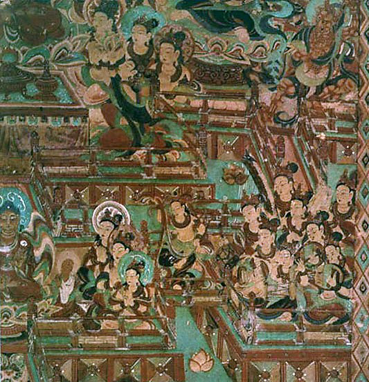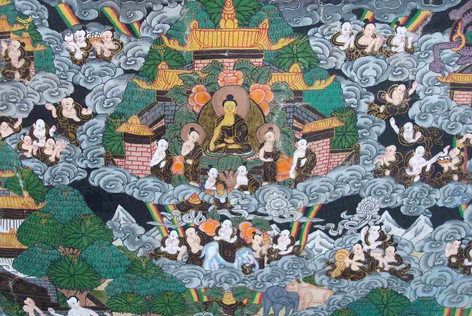 佛陀不离菩提树下,上升须弥山帝释宫殿。帝释庄严宫殿,迎佛入座。