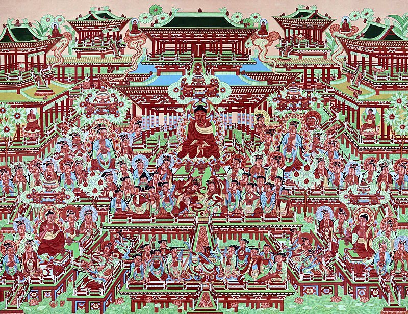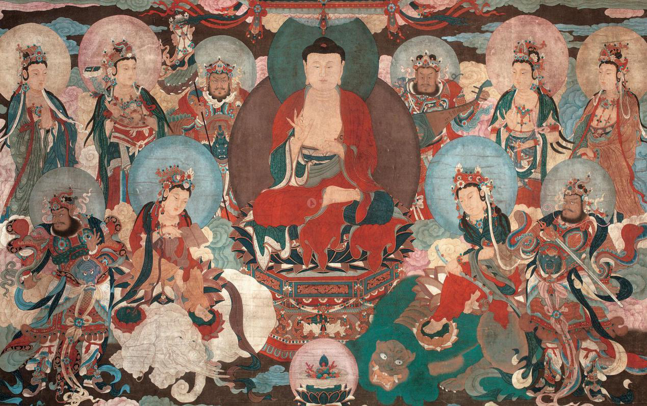佛陀在他化自在天宫摩尼宝殿,诸方世界诸大菩萨都来集会。