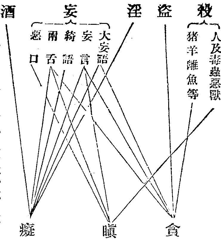 此五戒者,守之则成善行,为成佛之基础;反之即成恶业,乃沉沦之本源。夫一切恶业皆从烦恼而生,贪嗔痴为烦恼之根本,今试分析研究五戒之性质,悉摄入三者之中,俾防守者,知其根源而根本对治也。