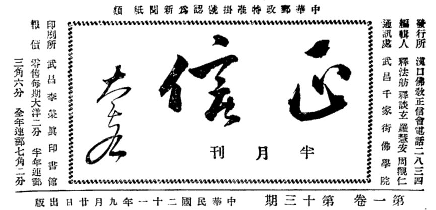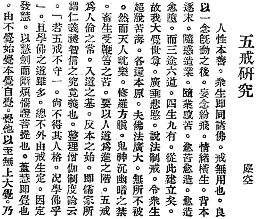 这篇《五戒研究》,原载于《正信》杂志1932年第1卷第13期(9月20日出版)。该杂志为半月刊,由汉口佛教正信会发行,刊名乃太虚大师亲自题写。当时太虚大师于武昌佛学院的旧址上成立了世界佛学苑图书馆,尘空法师即图书馆研究部首批研究员之一。