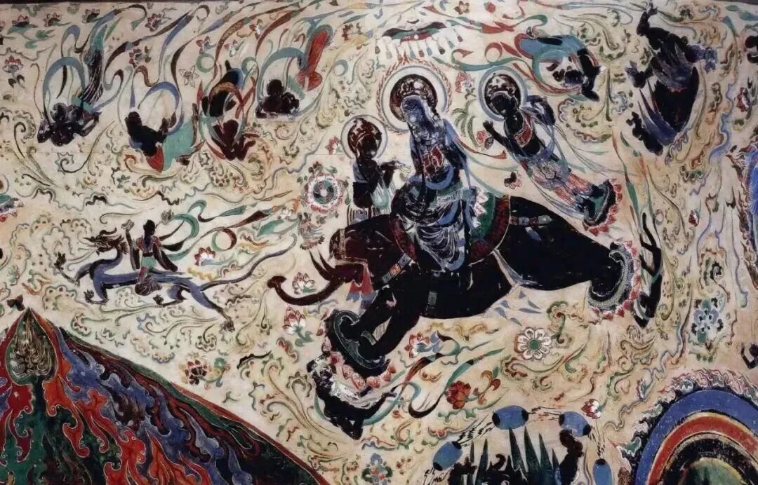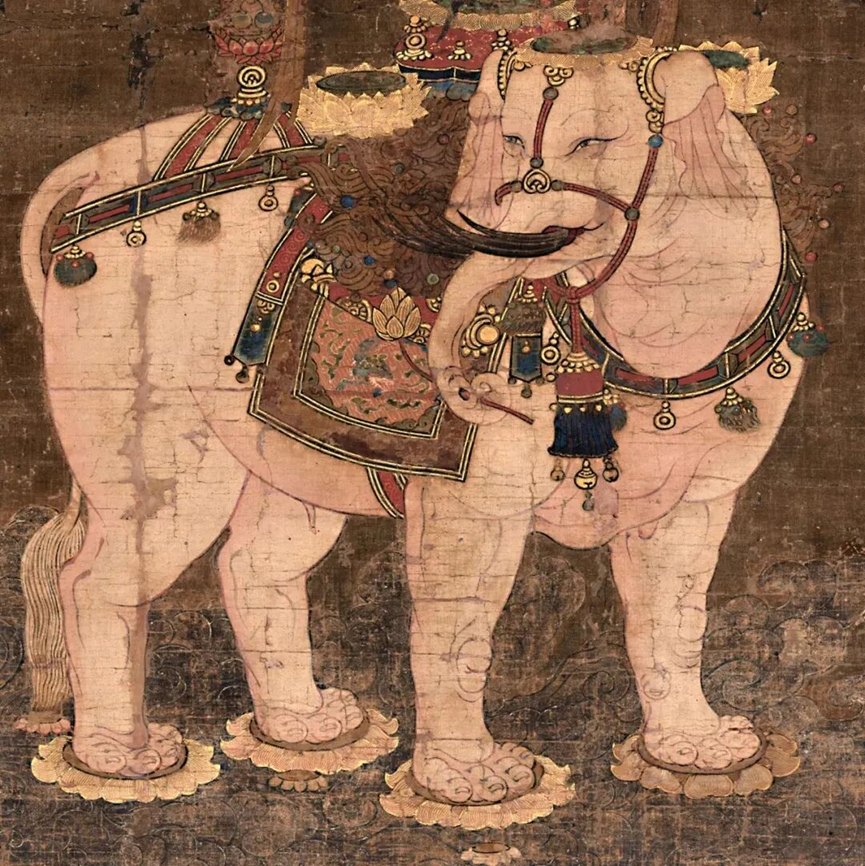 看过《西游记》中狮驼岭一段的人对于文殊菩萨以青狮为坐骑和普贤菩萨以白象为坐骑都不会陌生。抛开小说虚构的情节不谈,普贤菩萨坐骑形象确实是出自佛教经论,而且不是一般的象,是一头长着六根长牙的白色大象。如《佛说观普贤菩萨行法经》云:“普贤菩萨身量无边、音声无边、色像无边,欲来此国,入自在神通促身令小,阎浮提人三障重故。以智慧力化乘白象,其象六牙……”这一形象并非简单的装饰,而是佛教以象表法,六牙、白色,乃至大象体态,各有其明确义涵。