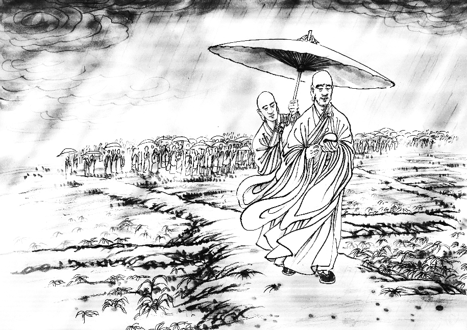 亢旱年,村民恳请大师祈雨。大师手击木鱼,循田埂念佛,一时,雨下如注。村民及信众们自发地为大师建造禅堂寺院。自此法道大振,海内衲子归心,遂成一大丛林。