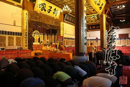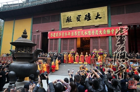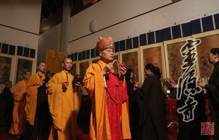下午一点,大雄宝殿内钟鼓齐鸣,梵唱清扬,庄严肃穆。在虔诚的念佛引导声中,光泉大和尚等主法诸师率全体法师及诸善信人等奉请圣驾,念佛引导,齐声恭送十方法界诸佛菩萨圣众直登云路,俱还真境,六道凡众并诸眷属往生净土,径趋莲邦。