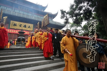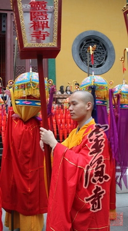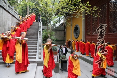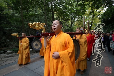 在开道锣、开道旗、幡、宝盖、水陆灯等仪仗的引导下,送圣队伍浩浩荡荡从灵隐寺大雄宝殿出发,沿天曹桥路经白乐桥,到达山门前的"咫尺西天",一路高唱佛号,次第行进,引得无数游人信众争先围观,瞩目赞叹。